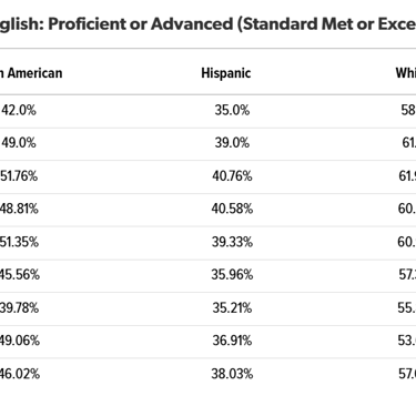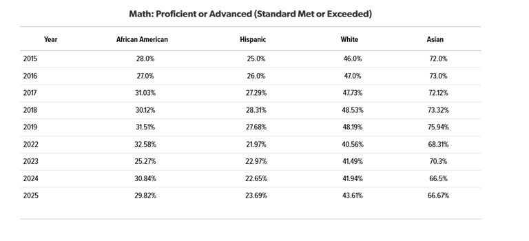 This isn't a recent development. Since 2015, these achievement gaps have remained stubbornly consistent, with only minor fluctuations but no meaningful progress. Black students actually lost ground from 2024, dropping from 49.06% to 46.02% in English and from 30.84% to 29.82% in math.